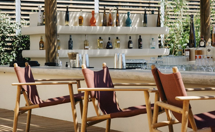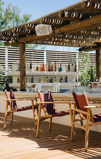 Entrée et bar du restaurant de plage Pampelonne, terrasse bois et architecture méditerranéenne